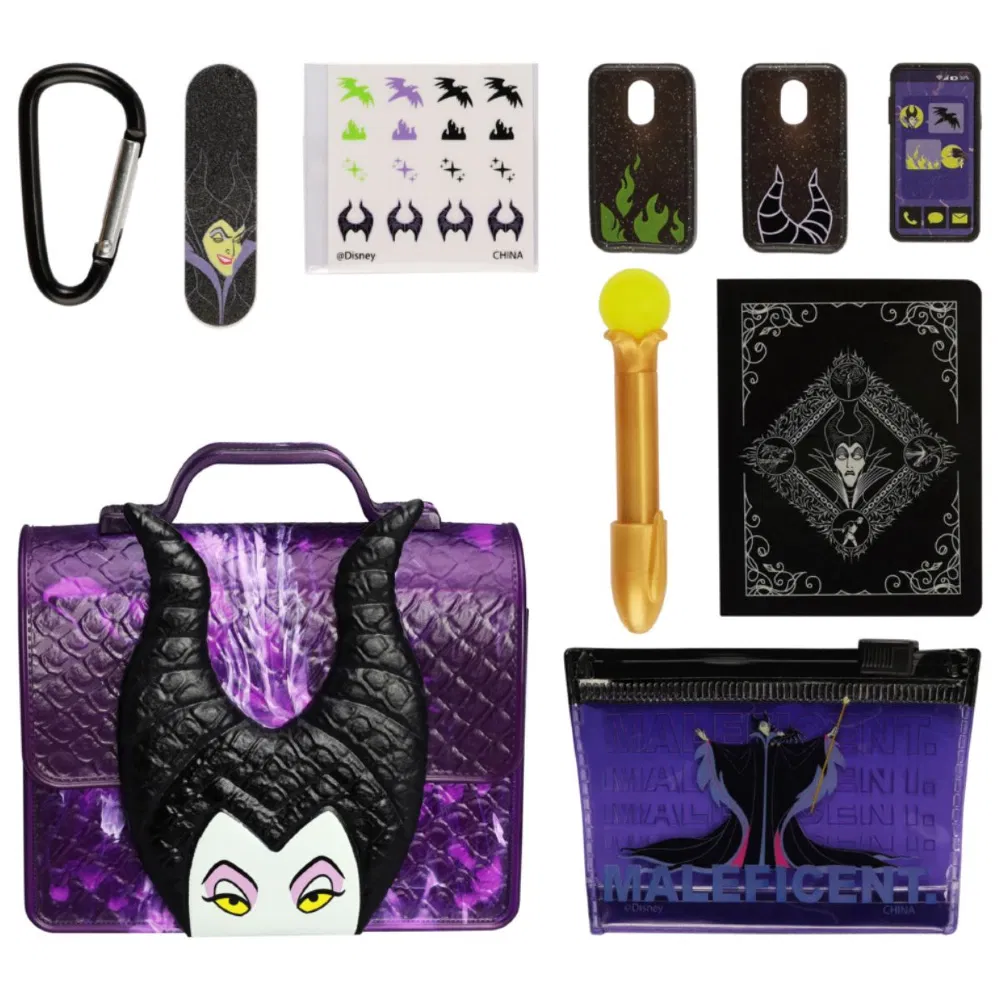 Micro bolso de mano Disney Real Littles, lindo micro bolso con el tema de Disney La Bella Durmiente, que realmente podes usar. ¿Qué sorpresas de Disney La Bella Durmiente encontrarás en tu cartera Malefica? El set incluye una mini cartera y 6 sorpresas.
