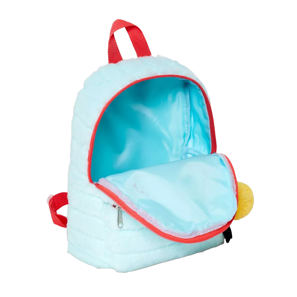 Fabricada con tela de poliéster microplush, esta mochila tiene correas de hombro ajustables y un asa superior para facilitar el transporte.