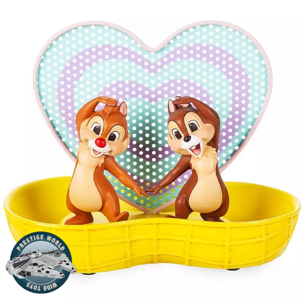 Bandeja en forma de cáscara de maní. Figuras de Chip 'n Dale totalmente esculpidas. Corazón de metal con perforaciones, perfecto para colgar aros o bijouterie. Almohadillas en la parte inferior.