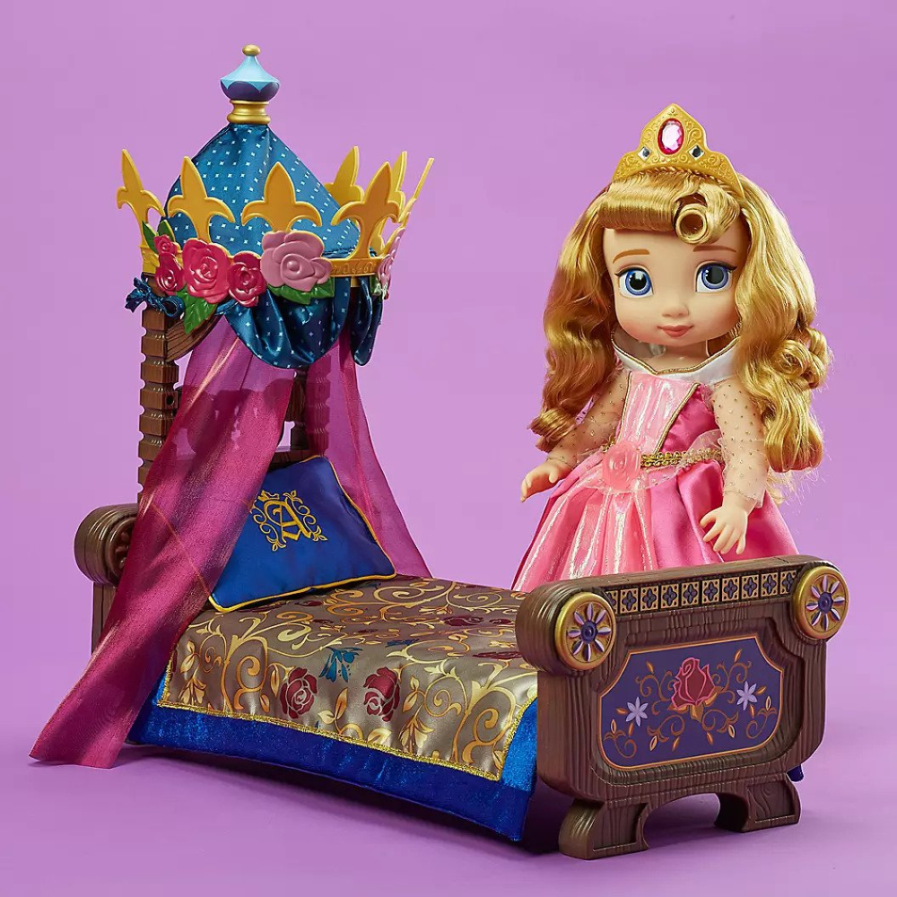 El juego incluye cama con dosel, almohada, manta, ropa de cama y colchón. El dosel presenta una corona con detalles florales y una cubierta de satén azul con un patrón de diamantes por todas partes. Unas cortinas de organza púrpura brillante. La manta cuenta con un estampado rosa completo, borde azul satinado y detalles dorados metálicos. Se combina con la colección Aurora Doll Special Edition de Disney Animators, se vende por separado.