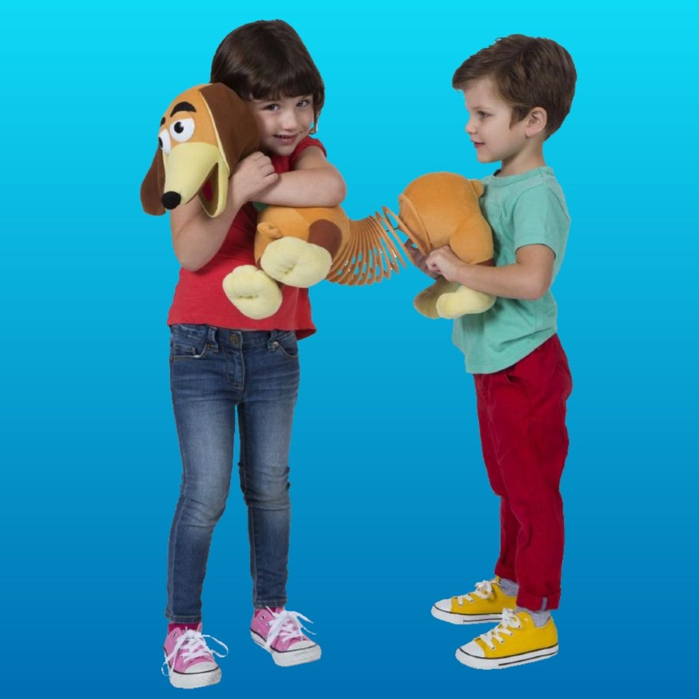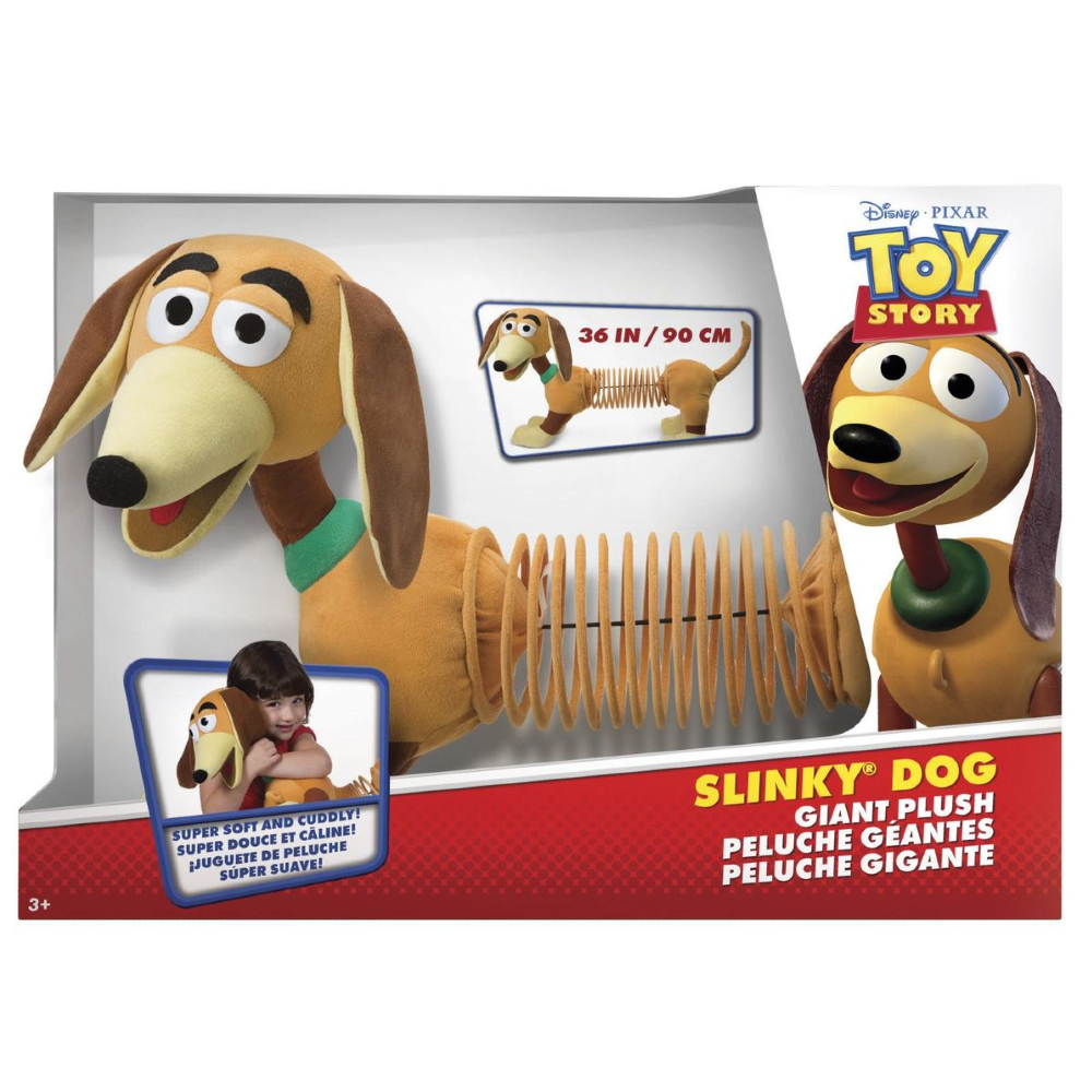 Estira al perro Slinky hasta 90 Cm de largo. Giant Plush Slinky Dog está cubierto de tela plush para que sea suave y tierno. Un juguete perfecto para todos los amantes de Toy Story.