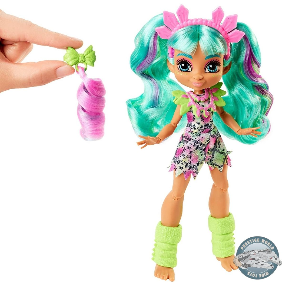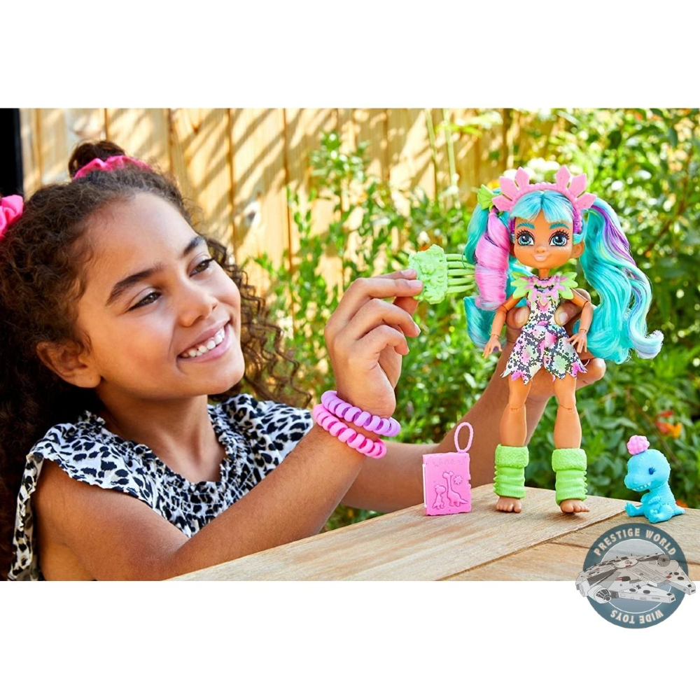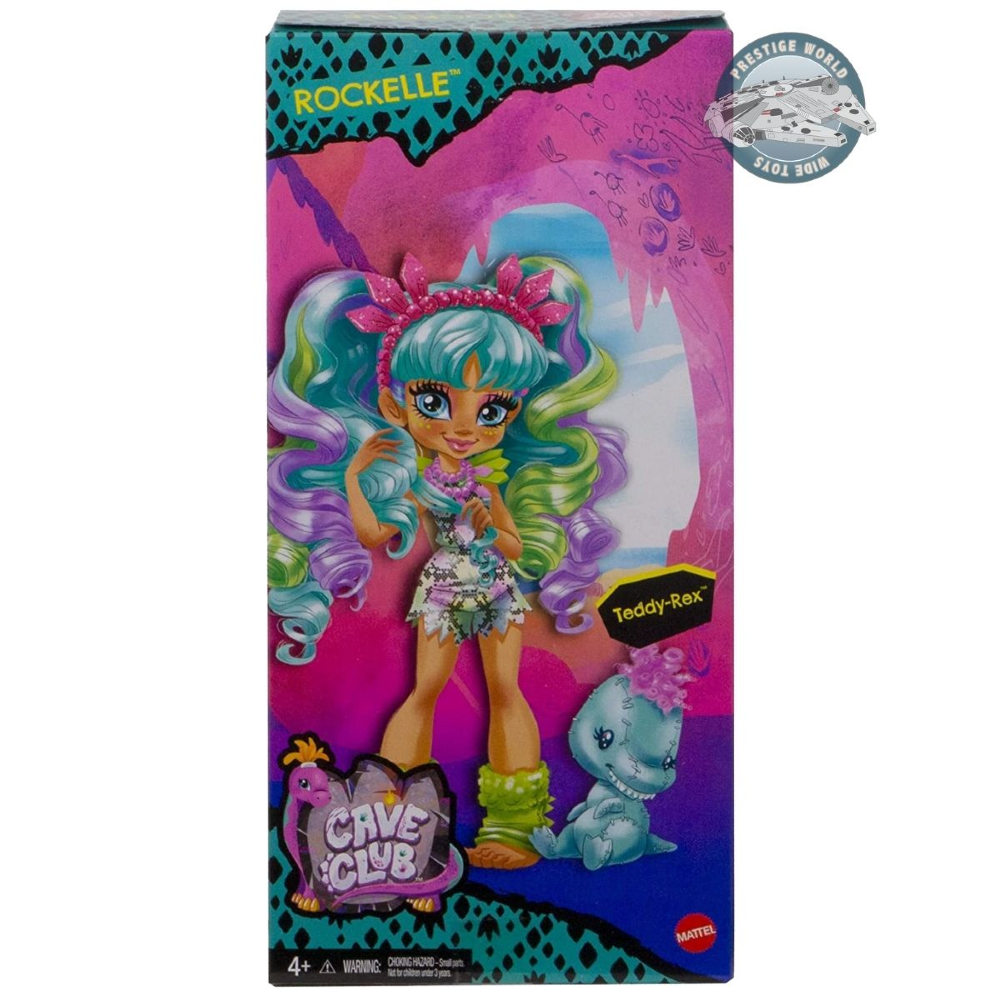 La muñeca Cave Club Rockelle está lista para cualquier aventura con un colorido mameluco con estampado de animales y apliques a tono. Incluye su adorable dinosaurio "felpa" Teddy-Rex, además de un peine y un álbum de recortes que contiene un genial "artefacto" de dinosaurio, también tiene un mechón de pelo con aplique. Los niños pueden crear estilos nuevos y atrevidos con un accesorio de extensión de cabello brillante de neón
