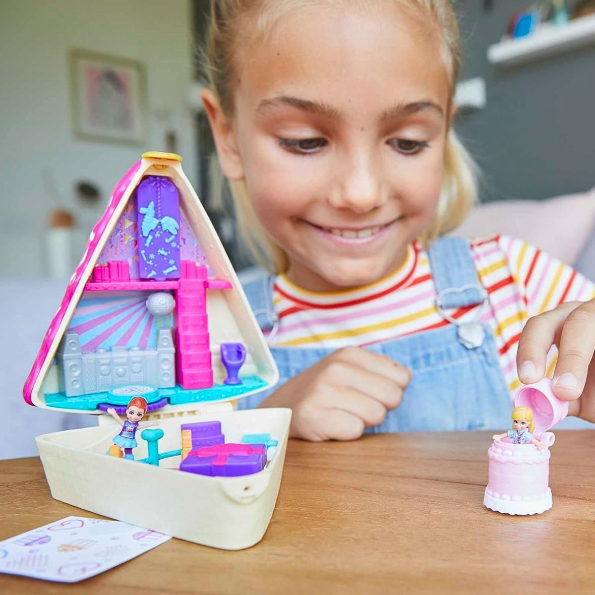 Es hora de celebrar el cumpleaños de la muñeca Polly con el playset Pocket World Birthday Cake Bash! Con la forma de una porción de pastel de cumpleaños, el set se abre a un mundo con temática de fiesta de cumpleaños completo con micro muñecas Polly y Lila.