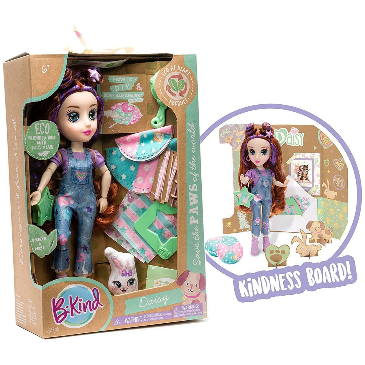 Partes específicas de la muñeca BKind están hechas de plástico reciclado, la tinta está hecha de soja, las muñecas usan ropa ecológica y el empaque es reutilizable