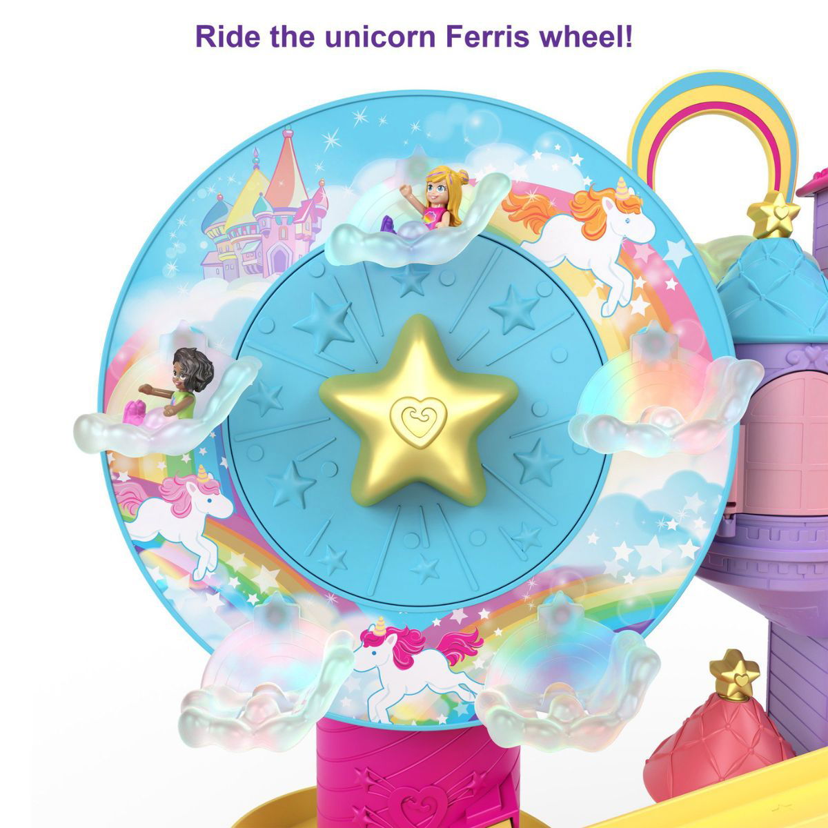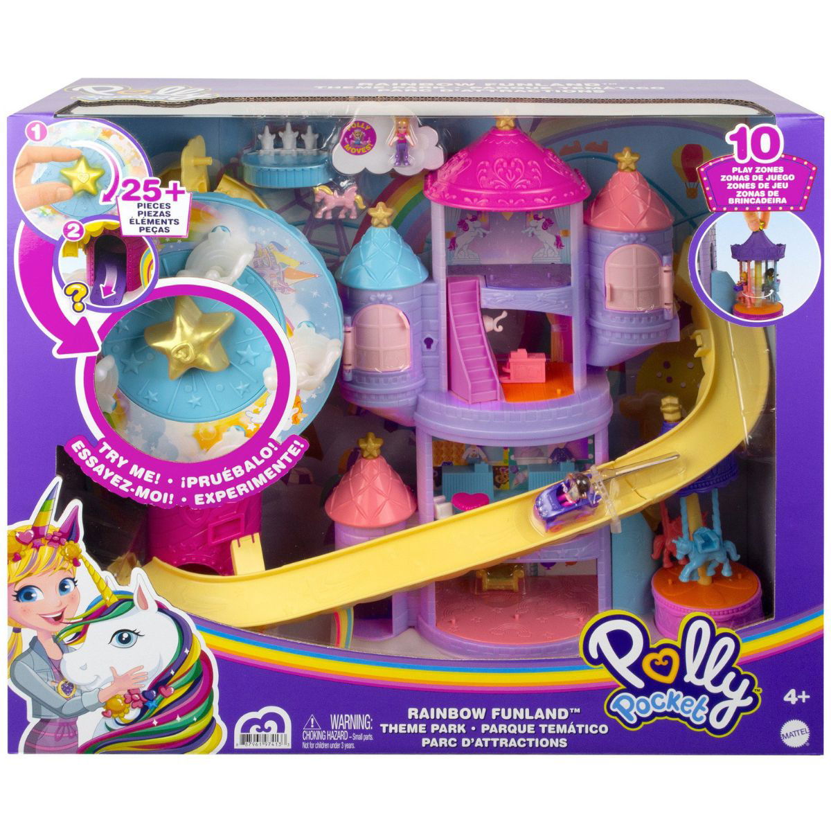 El parque temático Rainbow Funland es una experiencia de juego increíble que cuenta con 3 atracciones, 7 áreas de juego, muñecas micro Polly y Shani, 2 unicornios y 25 sorpresas (30 piezas de juego en total).