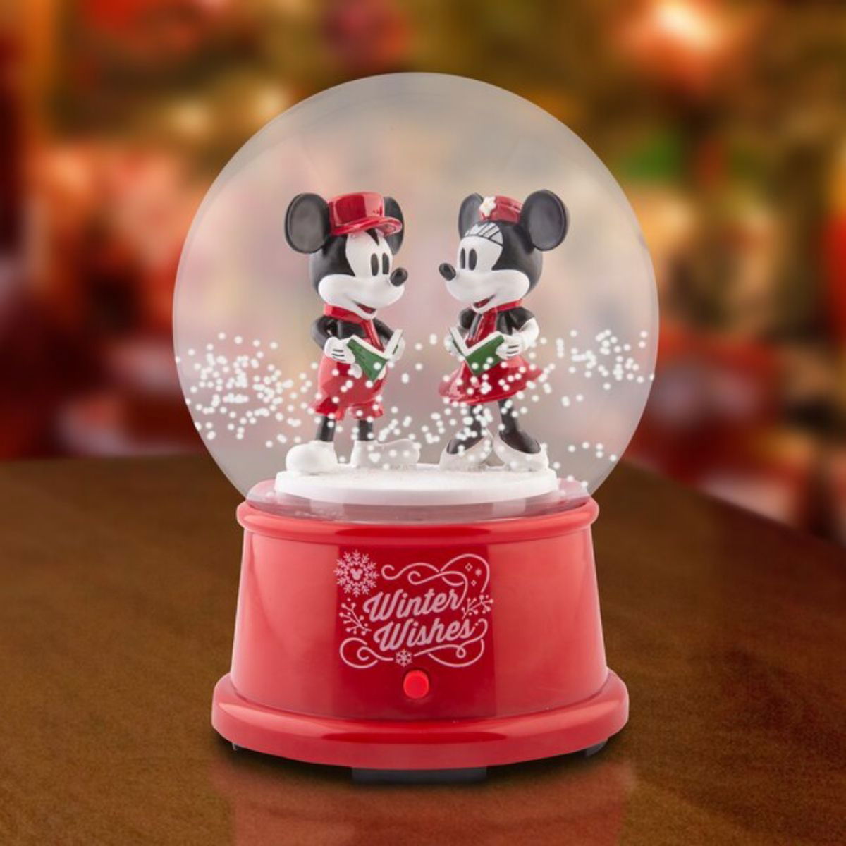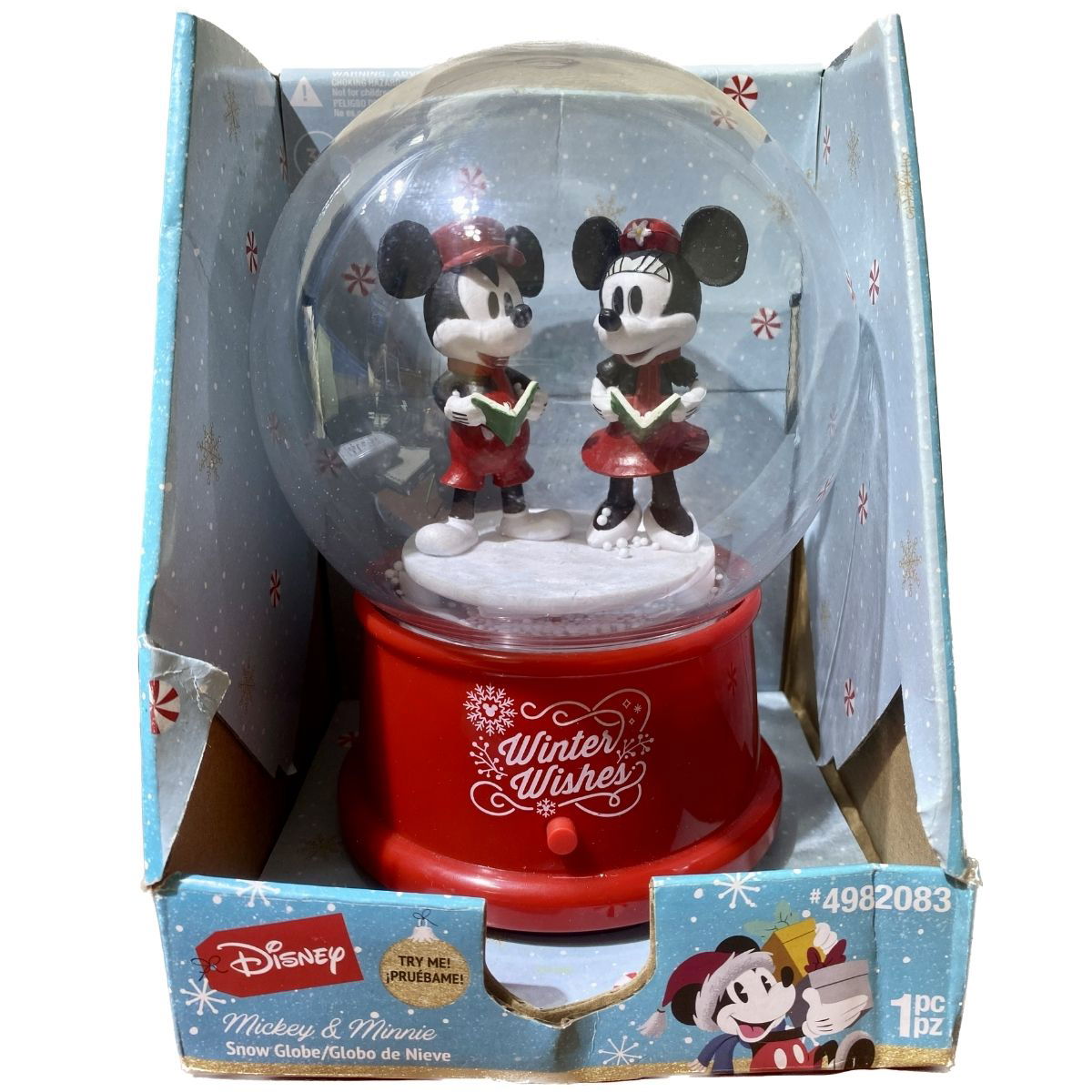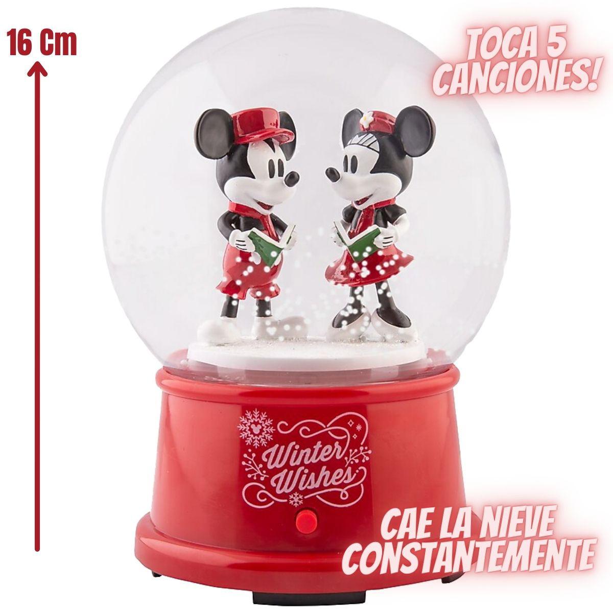 Globo de nieve navideño musical de Mickey Mouse y Minnie Mouse para interior con efecto de nieve arremolinada. Presenta una escena de villancicos de Mickey Mouse y Minnie Mouse.
