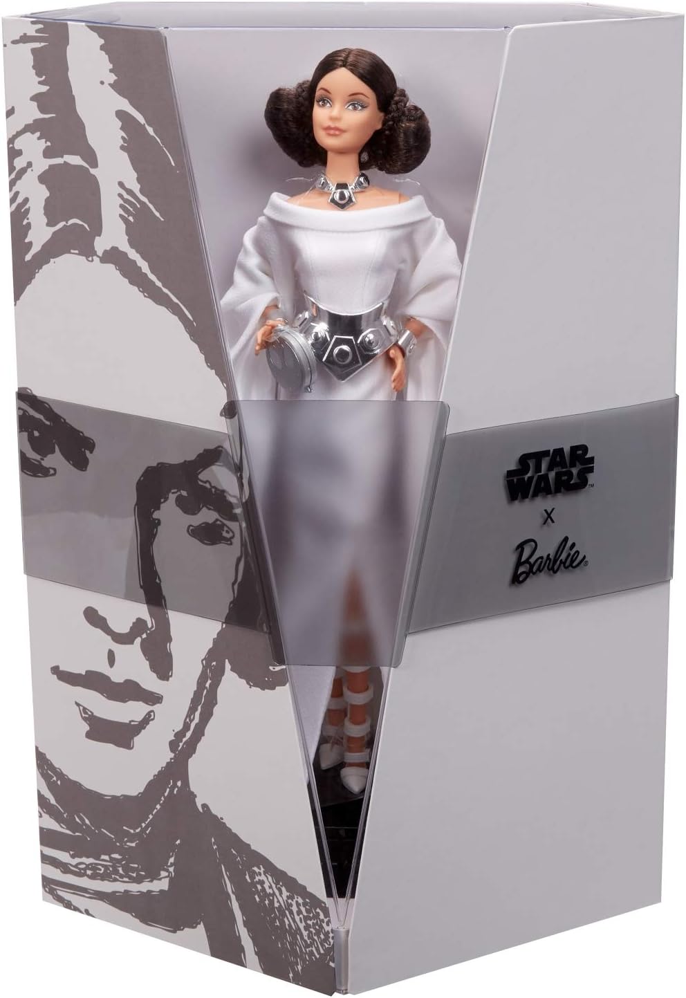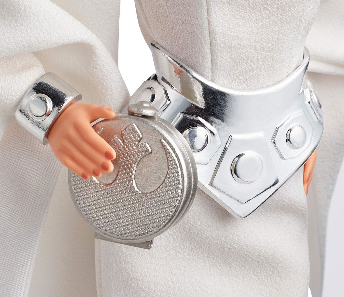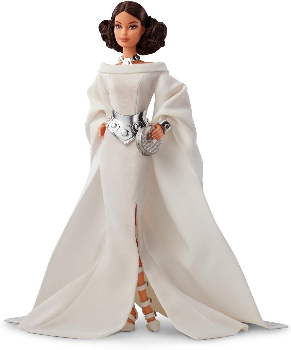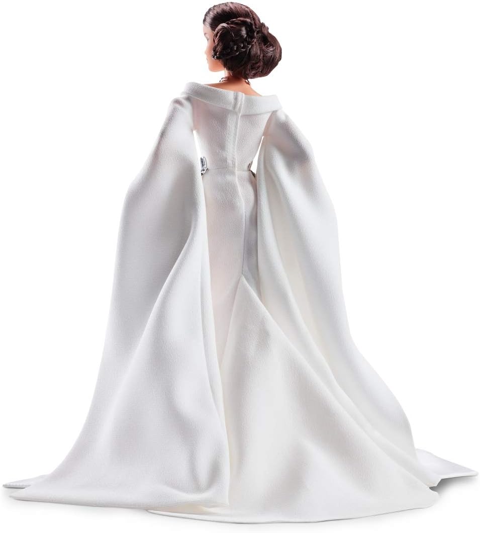 Esta muñeca Barbie de Star Wars coleccionable refleja el característico aspecto de la Princesa Leia, con un elegante traje blanco con mangas largas que llegan hasta el suelo. También incluye detalles como un cinturón de peplo plateado, pulseras y un recogido inspirado en su característico moño.