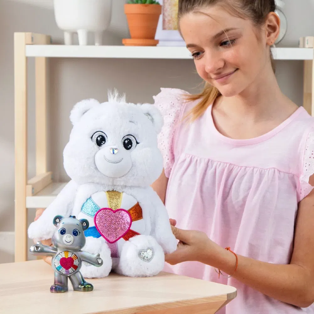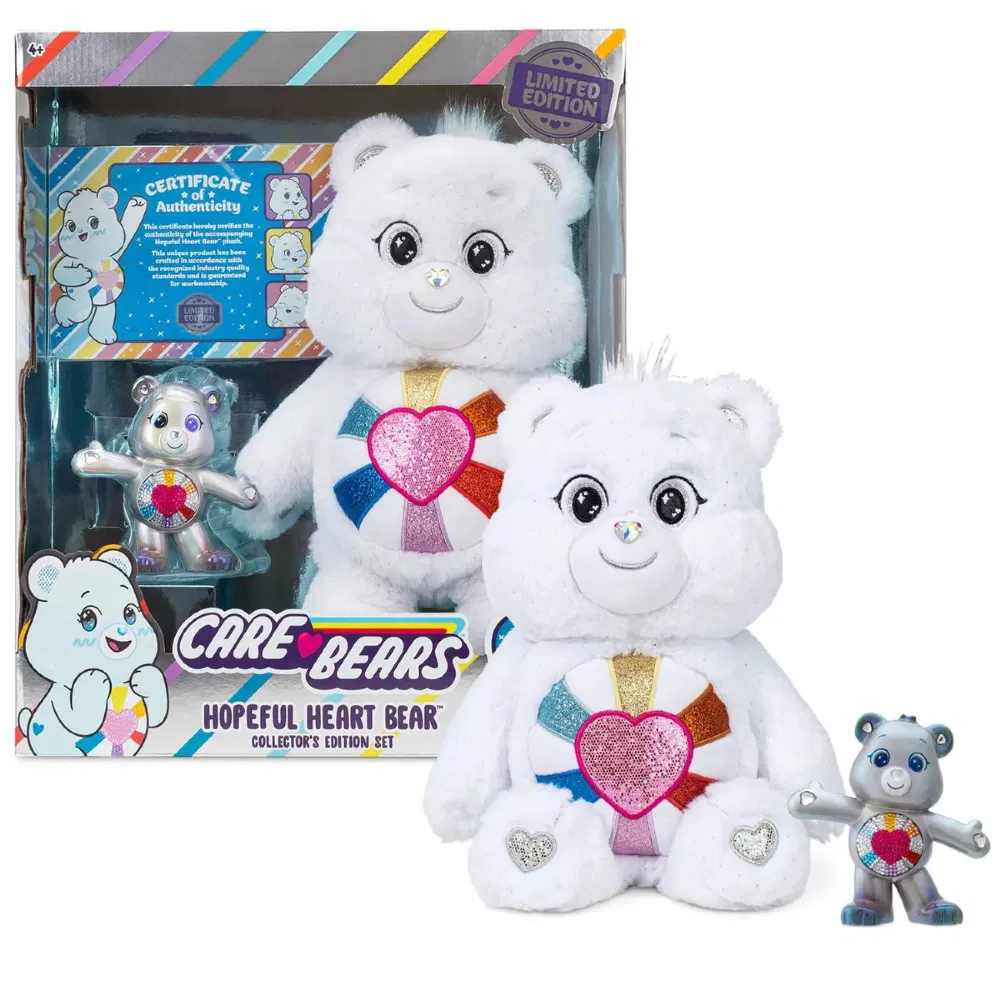 Prepárate para sentir el poder de la positividad con el TOTALMENTE NUEVO Care Bears Hopeful Heart Bear Collector's Edition Set. Hopeful Heart Bear es un dulce oso que ve el lado positivo y cree que todo siempre saldrá bien. Con un nuevo aspecto EXCLUSIVO BRILLANTE! ¡Te encantará su deslumbrante pelaje plateado, su nariz de gema en forma de corazón, sus brillantes ojos, orejas y patas plateados, y su brillante insignia en el vientre que brilla con hermosos rayos de esperanza! Este playset exclusivo para coleccionistas, también incluye una figura coleccionable para el doble de diversión y un Certificado de autenticidad para que su amistad sea oficial. ¡Imprescindible para cualquier fan o coleccionista de Care Bears!
