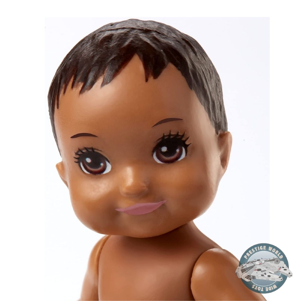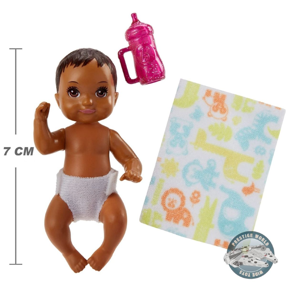 El set de baby-sitter incluye una figura de bebé con pañal, además de un mamadera y una manta para bebé, en el típico diseño de Barbie.