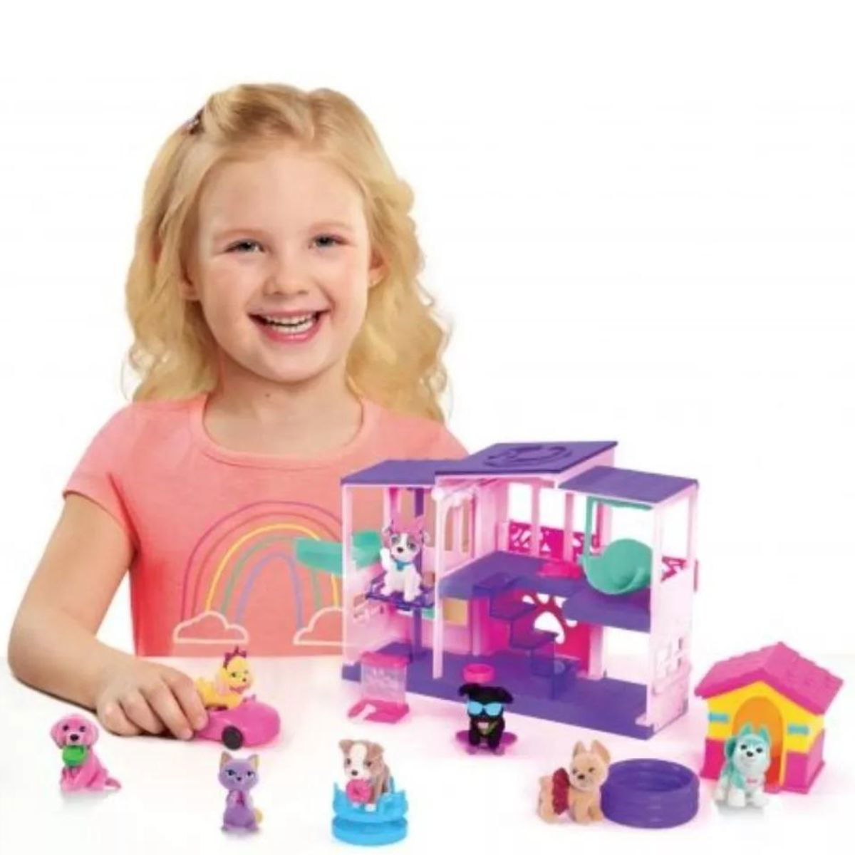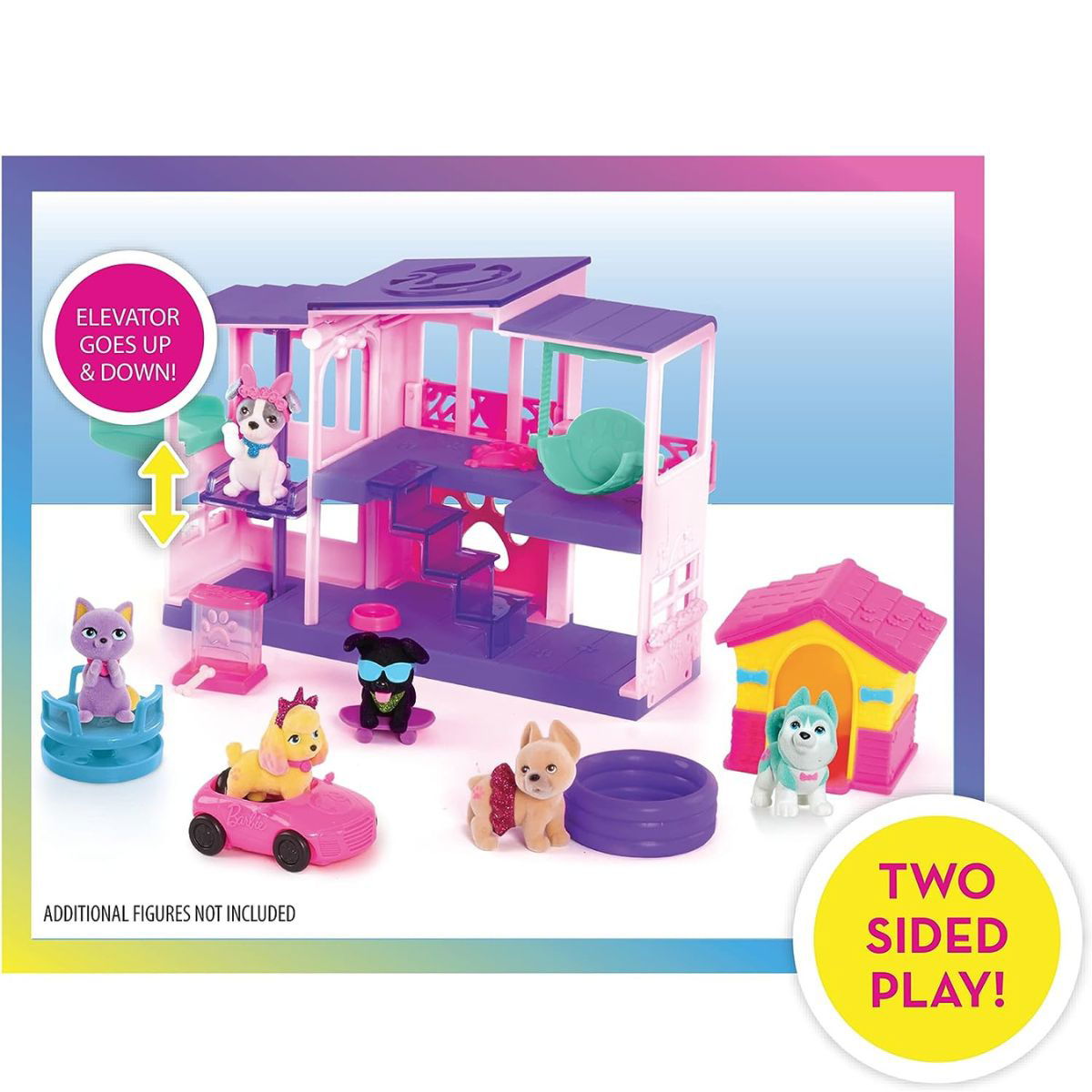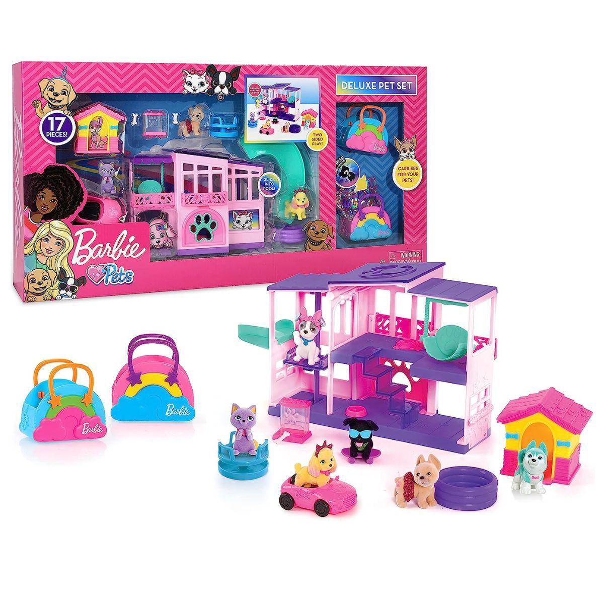 ¡Ahora puedes jugar con la casa de Barbie Pet Set Dreamhouse Deluxe con 17 Piezas, que va más allá de lo que cualquier mascota podría soñar e incluye una gran cantidad de accesorios. La casa es perfecta para jugar a dos caras y cuenta con un tobogán, un columpio y un ascensor que funciona para llevar mascotas del primer al segundo piso. Incluye 4 mascotas, una de ellas es sorpresa.