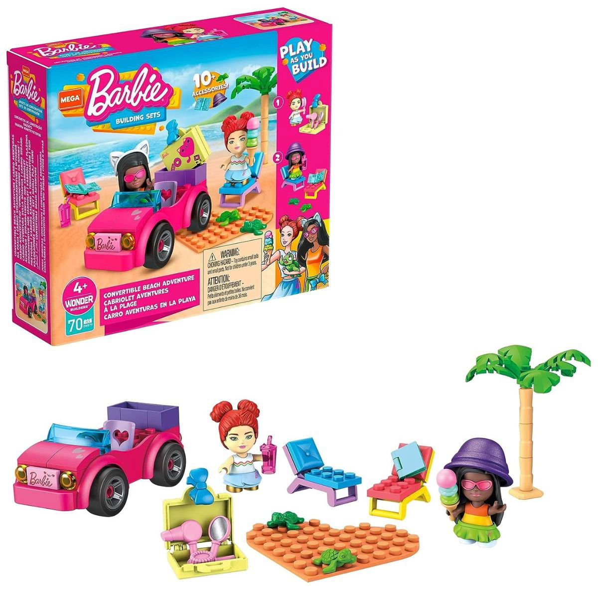 Embárcate en una aventura convertible en la playa con 2 micro muñecas Barbie. Juega mientras construyes el descapotable rosa y los accesorios de playset como sillas de playa, palmeras y más.